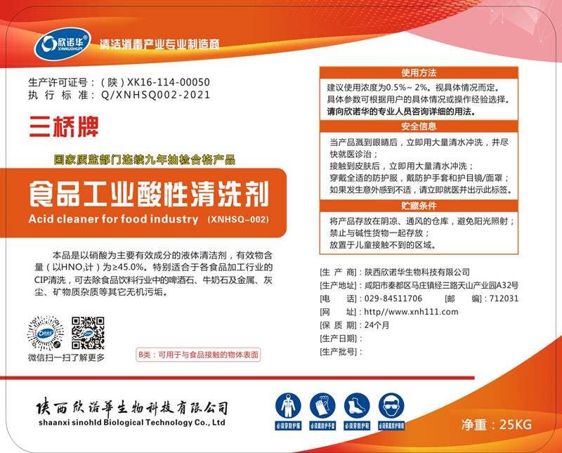 三橋牌食品工業(yè)酸性清洗劑(XNHSQ-2型)是以硝酸為主要有效成分的液體清潔劑,有效成份為≥ 45%,特別適合用于食品、飲料、乳品、啤酒等行業(yè)設(shè)備,容器、管道的CIP清洗使用。