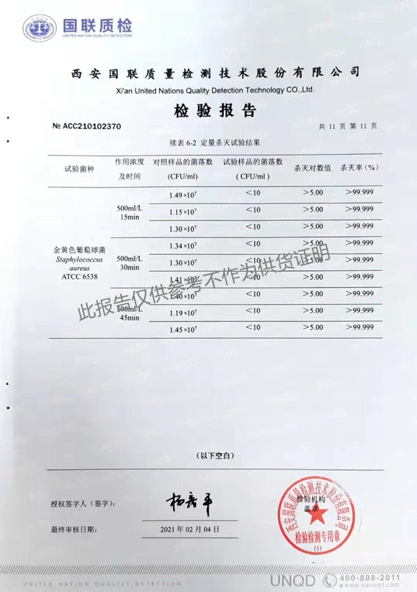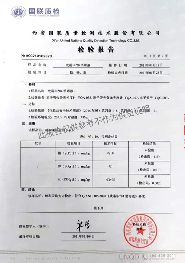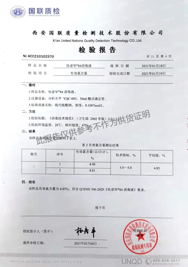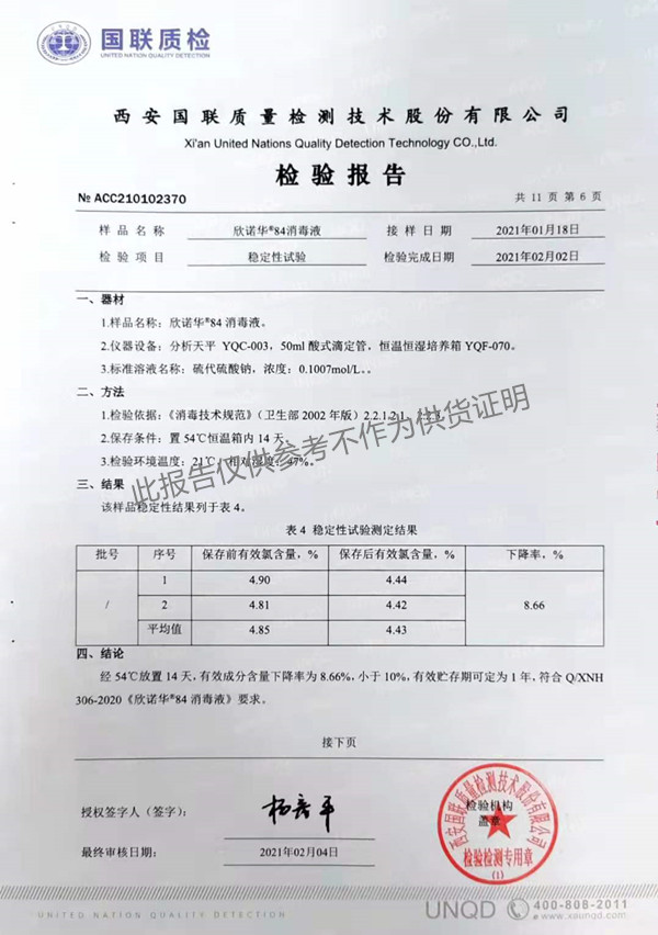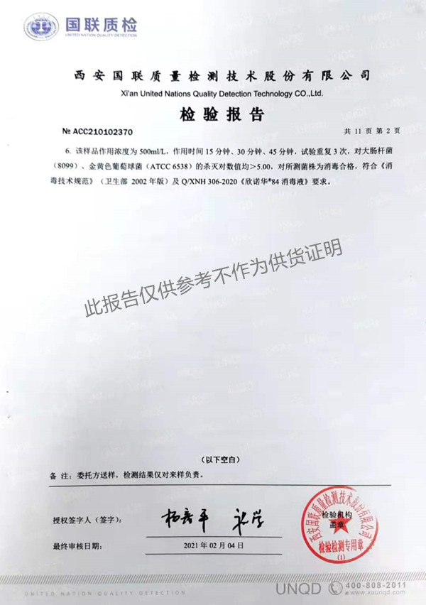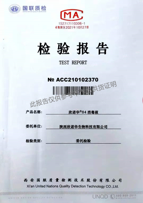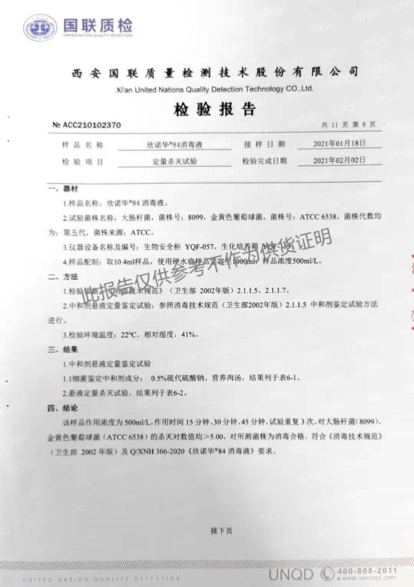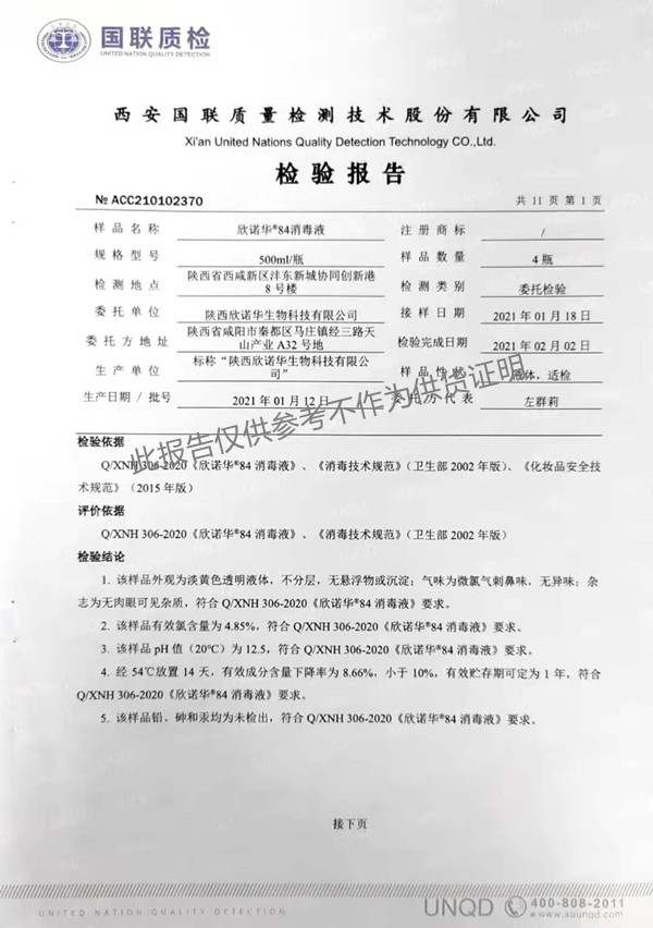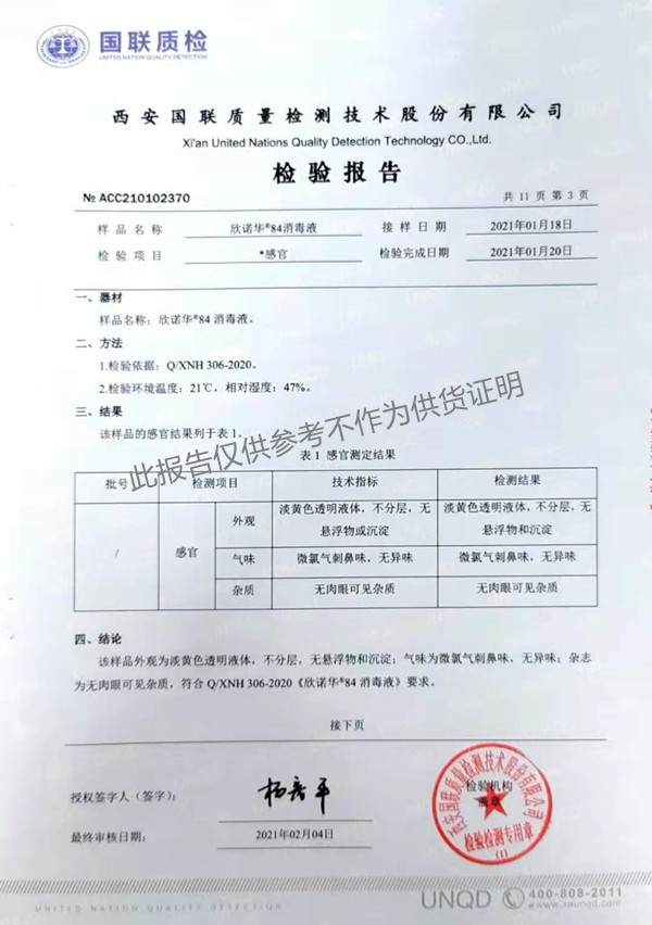 欣諾華84消毒液(XNH306型)檢測報(bào)告(2021年度)-陜西欣諾華生物科技有限公司