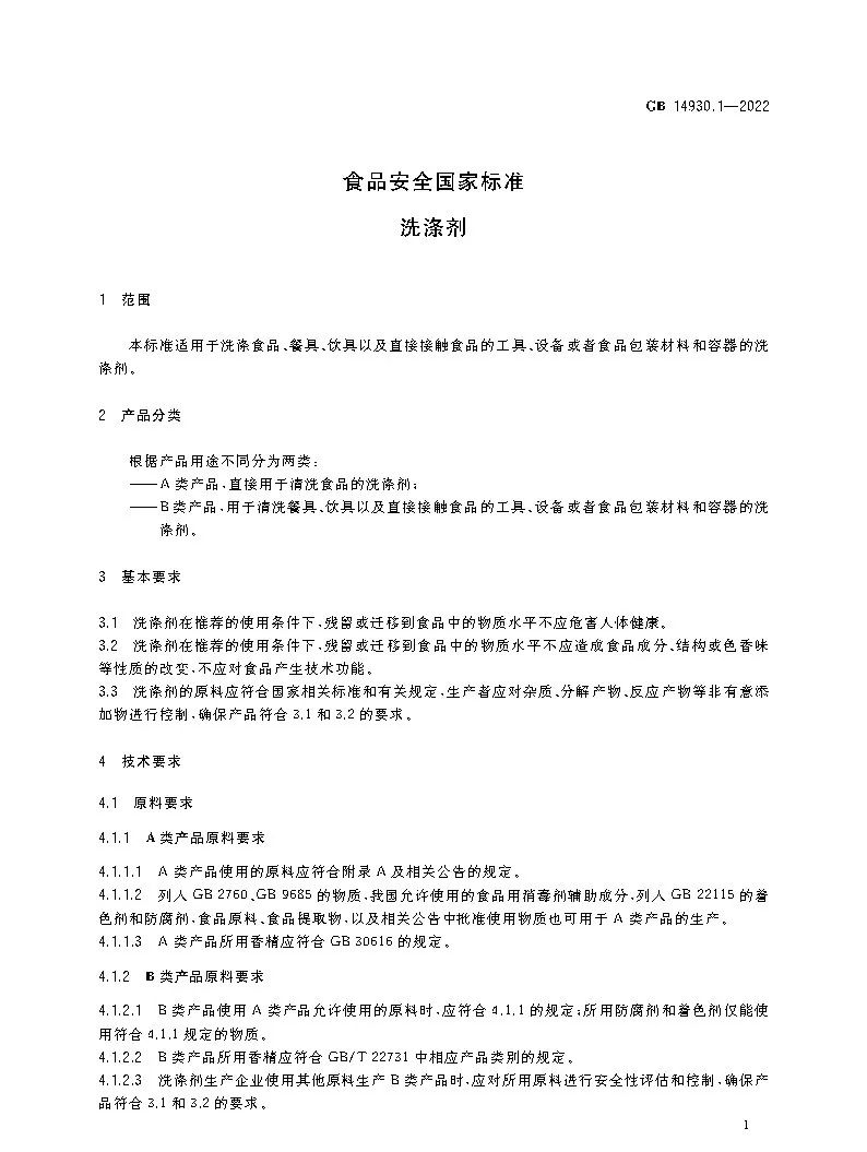 GB 14930.1-2022 食品安全國家標準 洗滌劑
