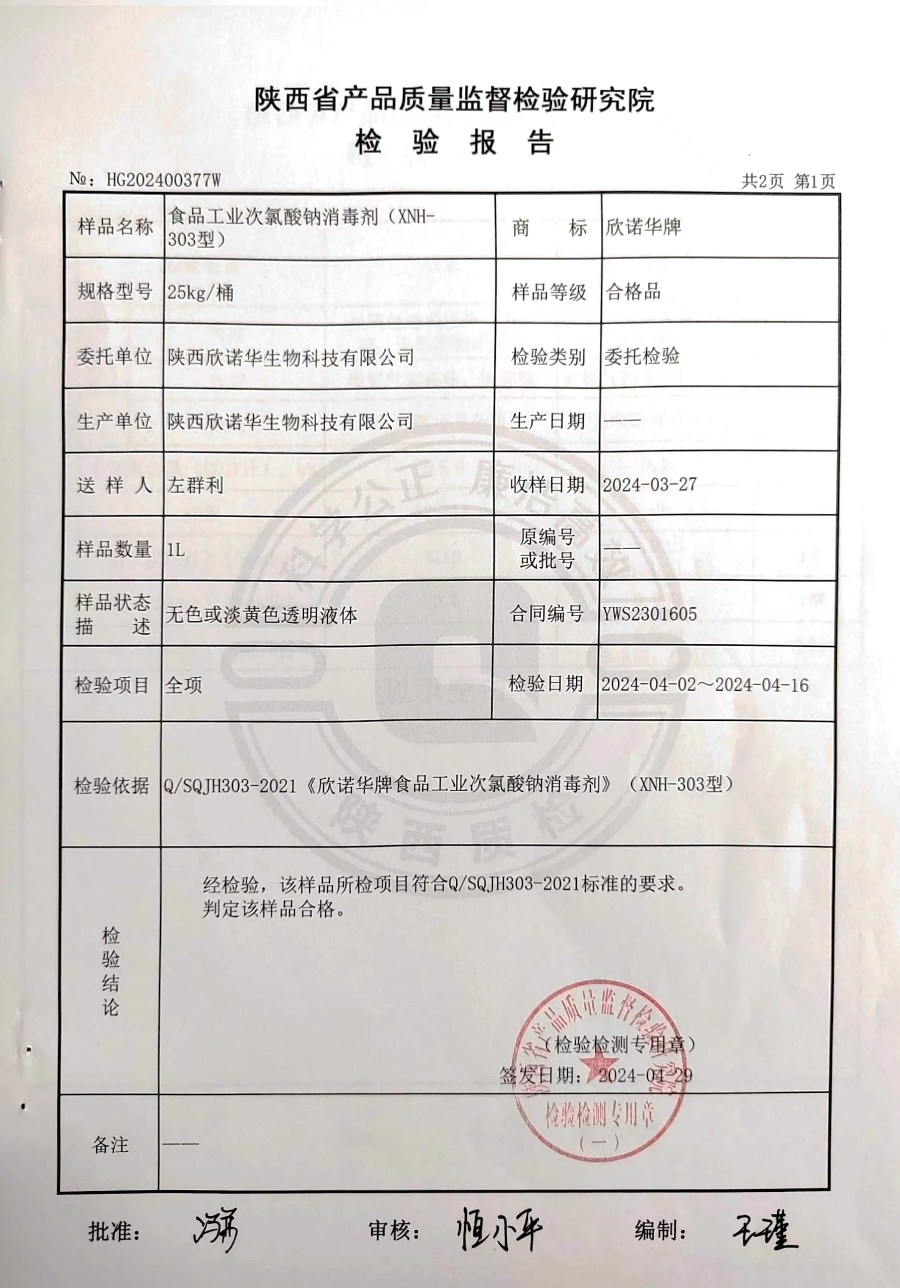 欣諾華牌食品級(jí)次氯酸鈉消毒劑檢測(cè)報(bào)告(XNH303型)(2024年度)-陜西欣諾華生物科技有限公司