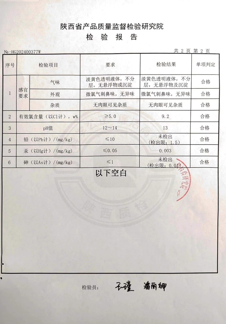 食品級(jí)次氯酸鈉消毒劑檢測(cè)報(bào)告(2024年度)