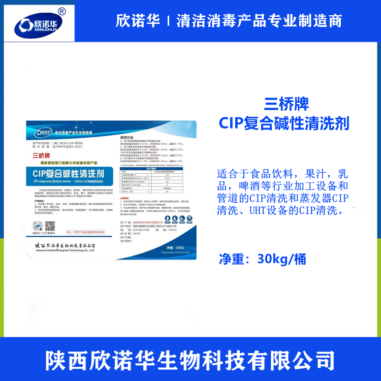 cip堿性清洗劑(商品名:三橋牌cip復合堿性清洗劑)是陜西欣諾華生物科技有限公司生產(chǎn)的以食品級堿、潤濕劑、滲透劑、緩蝕劑等,適合于食品飲料,果汁,乳品,啤酒等行業(yè)加工設備和管道的CIP和蒸發(fā)器CIP清洗和UHT設備的CIP清洗使用。